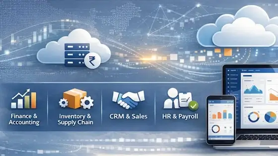 But today ERP means more of a cloud-based ERP where both apps and data are available online and hosted on the cloud.